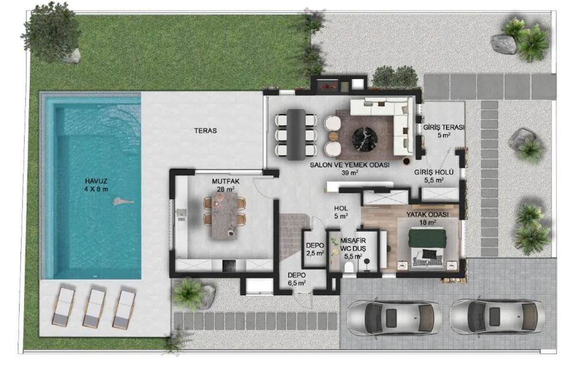 Our project has been inspired by historical and architectural details of the houses of Karmi village which is located on the Beşparmak Mountains. The touches that we designed with simplicity and elegancy are waiting for you in this project. A privileged and unique life begins in Edreville, one of the most beautiful residential areas of Kyrenia, in Edremit, with 23 villas, each designed to the smallest detail, with the quality of Özyalçın. With its privileged standards and lush nature, Edreville combines all the details of the life you dream of in a single project. Social areas, walking paths, playground and more. Everything has been designed by taking you, your family and nature into consideration. Surrounded by fascinating vegetation, Edremit’s large communal swimming pool and activity hall will inspire not only your weekends, but your whole lifestyle. Each of the buildings, which are integrated with the residential area in which they are located, has a unique view of Edremit and has been designed in such a way that you can invite the most beautiful shades of green into your daily life.